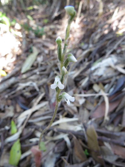 ・和名の由来 茎が青色で、キヌランと同じように茎に白い軟毛があることに由来する。私が見た範囲では、茎は青色ではなく、緑がかっているだけだが、青色には緑色も含まれるそうなので、そのように命名されたのかもしれない。 ・花の特徴等 Y字型の唇弁、白色の筋の入った緑色の花柄子房、茎に密につく白色の毛が目立つ。数枚が互生する葉は花時には枯れていることが多い。日本固有ではないが、分布は沖縄本島中部~北部のみ。 ある林道からマングースの巡視路に入った林縁に十数株のアオジクキヌランが生えていた。その時までに見たのは、ある自然公園の1株だけだったので、ある所にはあるものだと感心した。 |