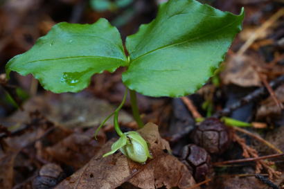 ・和名の由来 花がアツモリソウに似て、それより小さいことにに由来する。 ・花の特徴等 対生する葉の間から細い花柄を出し垂れ下がって一つの花をつける。唇弁は袋状で内外側に紅紫色の線状斑がある。 唇弁に紅紫色線状斑の無いものはシナノコアツモリソウと呼ばれている。 花が葉の下につく上、背萼片が特徴のある唇弁を覆い、その内側を隠しているので、写真を撮るには這いつくばりローアングルにしなければならない。 シナノコアツモリソウ-コアツモリソウの品種として2017年に発表された。唇弁に暗紫色の筋がなく、他はコアツモリソウと変わらない。 ![]() |