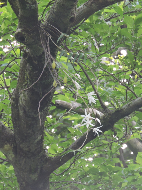 ・和名の由来 沖縄固有のセッコクに由来する。セッコクは漢名の石斛をセキコクと音読みしたものが、詰まってセッコクとなった。 ・花の特徴等 沖縄本島固有種の着生ラン。茎が長く下垂し、葉の落ちた脇から花序を出す。花色は白色~淡紅色で花期は1~3月と早い。 セッコクに似るが、唇弁の基部から上面にかけて軟毛が密生する2列の隆起があることがセッコクとの相違点のようであるが、遠くからしか見たことがないので判然としない。しかし、茎が長く垂れ下がって花をつけるのは、セッコクにはない特徴。 ![]() 唇弁の軟毛が密生する2列の隆起は確認できない。 ![]() セッコク
