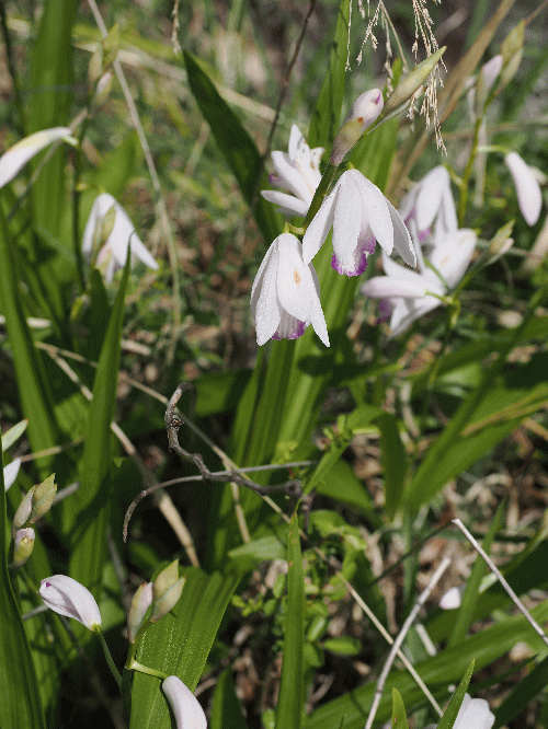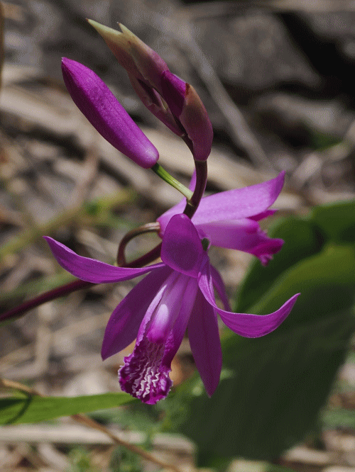 | 野生のシラン(観察日 5月7日) シラン(ラン科シラン属NT)は公園や民家の庭等でよく見かけるが、多分、全てが植栽と思われる。10年以上前に九州の平尾台で野生のシランは見たことがあるが、白花のシランは見ていない。 秩父地方には野生のシランがあり、白花もあると聞いたので出掛けることにした。立川駅が起点で青梅線、八高線、西武秩父線、秩父鉄道線と乗り継ぎ、3時間近くかけて、やっと到着。 シランは岩畳の至る所に咲いていた。白花も沢山あった。川の流れや山並みをバックに撮れるような場所を探したが、見つけることが出来なかったのが残念。 ・シラン(シラン属NT) ![]() ・花をアップ ![]() ・シロバナシラン-その名の通りシランの白花品 ・唇弁だけが少し赤紫色を帯びている株 ![]() ・ |