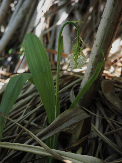 ・和名の由来 花茎が垂れ下がって花をつける様を鶏冠に、花茎が葉茎の傍に連れだって立 つ姿を夫婦に見立てたもの。左の画像は花茎が2本並んでいて夫婦と言ってもおかしくないが、普通は1株に花茎は1本だけ。 ・花の特徴等 名前も咲き方も一風変わっている。花茎が途中で弧を描いて垂れ下がり、先端に白色の花を密につける。唇弁は船形で中に黄色の板状のものがある。花が終わると花茎は立ち上がり、直立して実をつける。 日当たりの良い場所を好むので、道路脇や畑、草原等で比較的よく見かける。