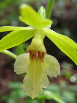 花色は萼片、側花弁が黄緑色、唇弁が黄色。唇弁は3裂し、裂片は不規則に切れ込む。基部は赤褐色に染まり、3本の襞がある。距は細く短く、子房に寄りそう。